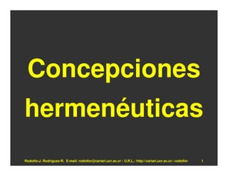 Este documento presenta una introducción a las concepciones hermenéuticas y a la filosofía hermenéutica de Hans-Georg Gadamer. Explora los diferentes sentidos de la hermenéutica, incluyendo la hermenéutica semántica, jurídica, teológica y crítica. También resume la vida y obra de Gadamer, destacando su influencia como alumno de Martin Heidegger y sus contribuciones a través de libros como Verdad y Método.
