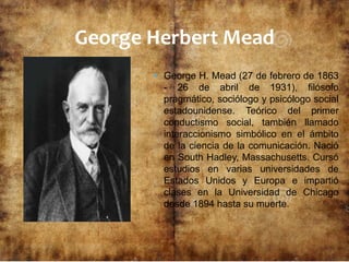 George H. Mead fue un filósofo, sociólogo y psicólogo estadounidense conocido por su teoría del interaccionismo simbólico. Aunque no publicó libros en vida, sus obras póstumas incluyen Mind, Self and Society, donde desarrolla su teoría del yo o "self". Mead argumenta que el yo surge a través de la interacción social y el uso del lenguaje. El niño adopta roles sociales a través del juego que le ayudan a comprender la sociedad. Mead considera que la autoconciencia solo