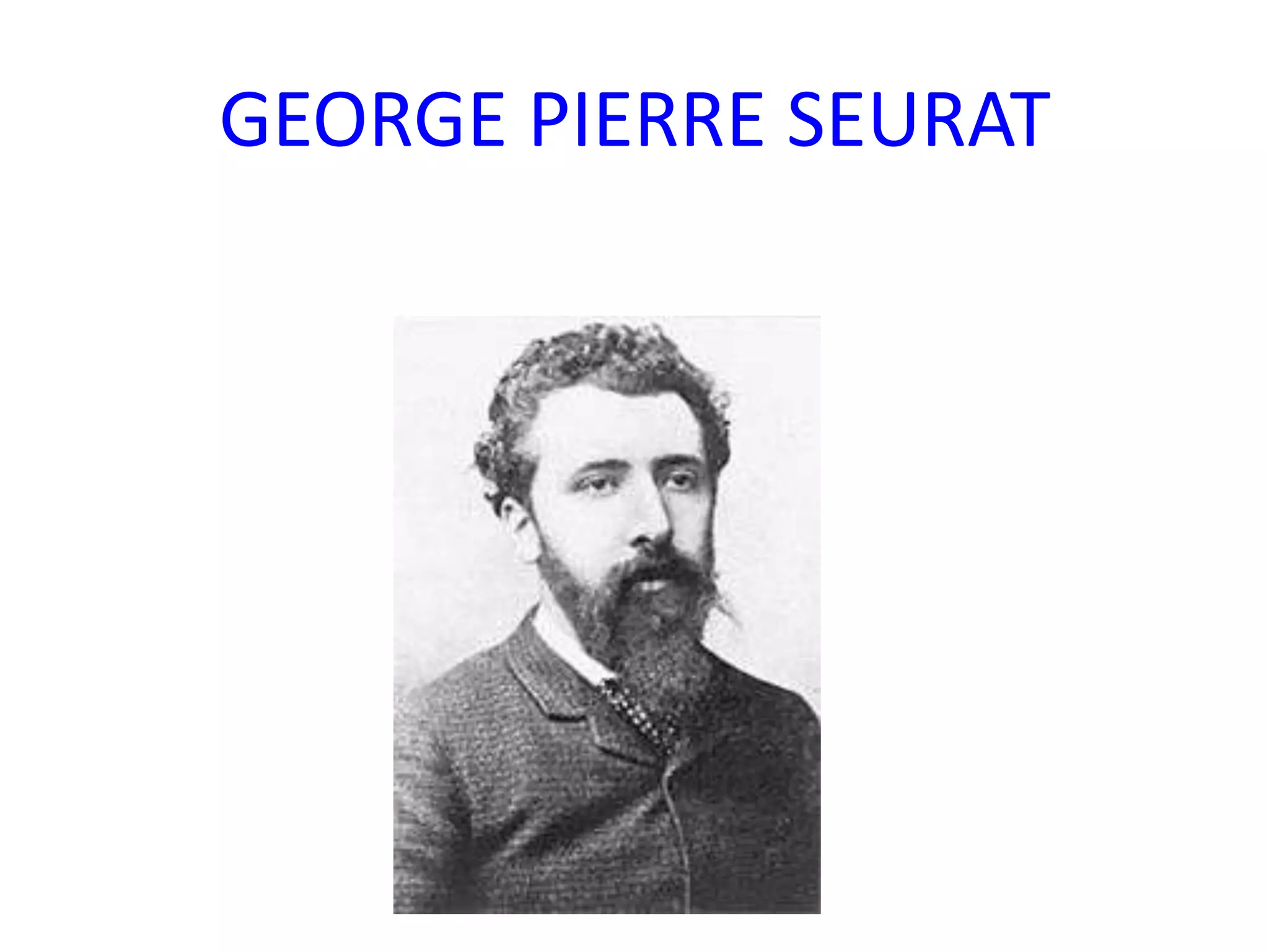 George Pierre Seurat fue un pintor francés del siglo XIX y fundador del neoimpresionismo o puntillismo. Pintaba predominantemente paisajes y escenas de la naturaleza usando pequeños puntos de color puro en lugar de mezclarlos, siguiendo la teoría del color de Michel Eugène Chevreul. Sus obras más famosas incluyen Un baño en Asnières, Tarde de domingo en la isla de la Grande Jatte, y Parada del circo.