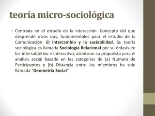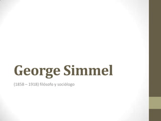 George Simmel fue un filósofo y sociólogo alemán del siglo XIX que desarrolló la teoría microsociológica, centrada en el estudio de la interacción humana. Introdujo conceptos como el intercambio y la sociabilidad. Su teoría enfatizó lo intersubjetivo e interactivo en el análisis social. Asimismo, propuso categorías como el número de participantes y la distancia entre ellos para estudiar la "geometría social". Su visión dinámica de la cultura y la sociedad sentó las