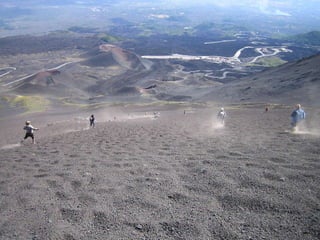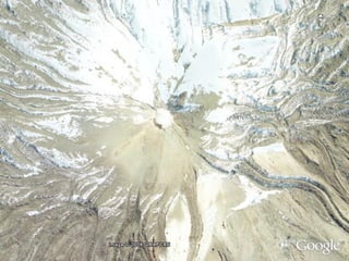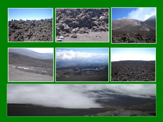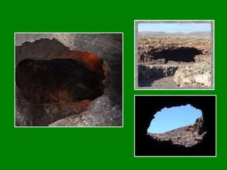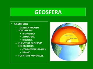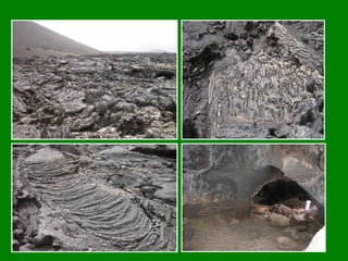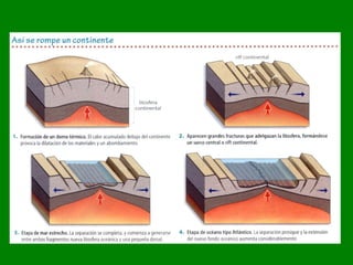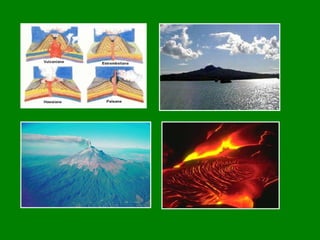 El documento describe los procesos geológicos internos y externos de la Tierra, incluyendo la formación de dorsales oceánicas, placas tectónicas, volcanes y riesgos geológicos. Los volcanes se localizan principalmente en límites de placas y zonas de construcción, y pueden causar daños a través de coladas de lava, lluvias de piroclastos, explosiones, nubes ardientes y lahares.