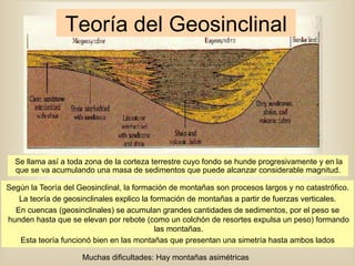 La teoría de los geosinclinales explica la formación de montañas a partir de la acumulación de sedimentos en cuencas que se hunden bajo su propio peso, elevándose luego por rebote para formar las montañas. Funciona bien para montañas simétricas pero tiene dificultades para explicar montañas asimétricas. La teoría propone que los procesos de formación de montañas son lentos en lugar de catastróficos.
