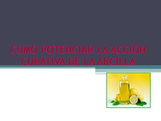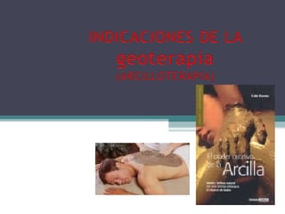 Este documento describe la geoterapia, que usa la tierra como agente curativo debido a sus propiedades químicas y energéticas. Explica que la arcilla es el material más utilizado en geoterapia debido a su capacidad de absorción y regulación de la temperatura, así como sus propiedades antiácidas y cicatrizantes. También resume los usos de la geoterapia para problemas agudos y crónicos, y cómo potenciar su acción curativa mediante el uso de hierbas medicinales, aceites esenciales y tinturas