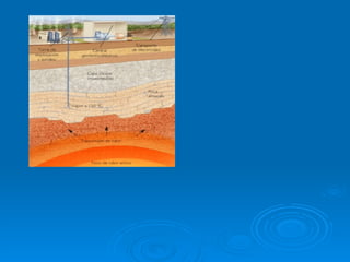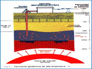 Este documento describe la energía geotérmica, incluyendo su origen, formas de aprovechamiento, ventajas e inconvenientes. La energía geotérmica se obtiene mediante el uso del vapor producido por las altas temperaturas del interior de la Tierra para calefacción y producción de electricidad. Presenta ventajas como ser renovable y favorecer el medio ambiente, pero también inconvenientes como la contaminación térmica y el impacto paisajístico.