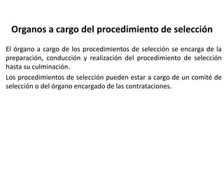 El documento describe los órganos a cargo de los procedimientos de selección para contrataciones con el Estado, incluyendo comités de selección y órganos encargados de las contrataciones. Explica sus funciones y composición, así como los documentos requeridos para cada procedimiento de selección.