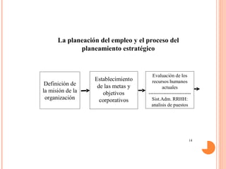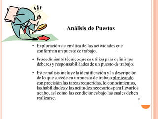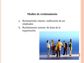 El documento habla sobre la gerencia de recursos humanos en una organización. Define la gerencia de recursos humanos como la capacidad de mantener a la organización productiva a través del uso adecuado de su recurso humano. Describe las funciones clave de la gerencia de recursos humanos como la planeación, reclutamiento, selección, inducción, entrenamiento y gestión del desempeño del personal. También discute la importancia del desarrollo continuo de los recursos humanos a través de la capacitación para mantener y fortalecer las habilidades
