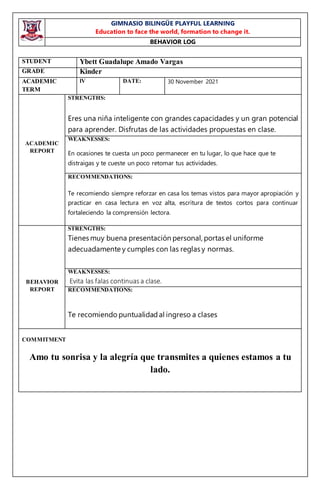Los documentos contienen los informes académicos y de comportamiento de varios estudiantes de kinder del Gimnasio Bilingüe Playful Learning. Los informes destacan las fortalezas y debilidades de cada estudiante en las áreas académica y de comportamiento, así como recomendaciones para mejorar.
