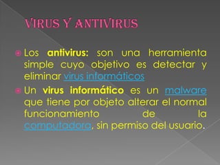 Este documento describe los antivirus como herramientas para detectar y eliminar virus informáticos, los cuales son malware que alteran el funcionamiento de la computadora sin permiso del usuario. Explica varios tipos de virus como de sobreescritura, falsos, polimórficos, caballos de troya, gusanos y de macros, estos últimos afectan archivos y plantillas que contienen macros al hacerse pasar por una y actuar cuando se abren o usan los archivos.