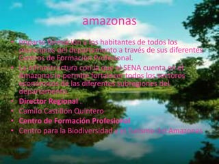 El documento describe la infraestructura y operación del Servicio Nacional de Aprendizaje (SENA) en los diferentes departamentos de Colombia. En cada departamento, el SENA brinda formación a través de centros de formación profesional y utiliza su infraestructura para fortalecer los sectores económicos de la región. Se enumeran los directores regionales y centros de formación de cada departamento.