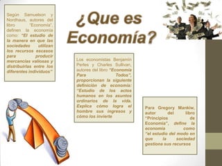 El documento presenta definiciones de economía de acuerdo a diferentes autores. Samuelson y Nordhaus definen economía como el estudio de cómo las sociedades usan recursos escasos para producir bienes valiosos y distribuirlos. Perles y Sullivan señalan que economía estudia los actos humanos en la vida ordinaria y cómo logran ingresos e invierten. Finalmente, Mankiw define economía como el estudio de cómo la sociedad gestiona sus recursos.