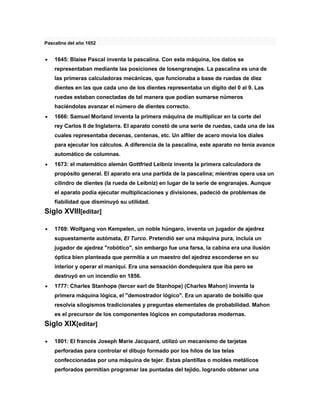 El documento resume brevemente la historia del desarrollo de los computadores desde el siglo XVII hasta mediados del siglo XX. Algunos de los hitos más importantes incluyen la invención de los logaritmos y los huesos de Napier en el siglo XVII, la primera calculadora mecánica diseñada por Wilhelm Schickard en 1623, y la máquina analítica de Charles Babbage en 1837, considerada el primer diseño de una computadora moderna. En el siglo XX, se desarrollaron las primeras computadoras electrónicas como la EN