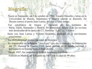 Damián Baca nació en Santander en 1986 y estudió filosofía y letras en varias universidades españolas. Fue catedrático de lengua y literatura y director de revistas literarias. Participó en el movimiento vanguardista Creacionismo y ganó el Premio Nacional de Literatura en 1925. Es conocido por su antología que presentó a la Generación del 27. Alterna la poesía tradicional y vanguardista en su obra.