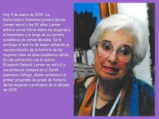 La historiadora feminista pionera Gerda Lerner murió a los 92 años. Fue la primera en establecer un programa de grado en historia de las mujeres en la década de 1970. Relató haber propuesto un curso sobre la historia de las mujeres y que le dijeron que ya enseñaban todo sobre las mujeres, a lo que respondió que siempre se contaba desde la perspectiva masculina. Lerner insistió en que las mujeres tenían su propia historia y tuvieron que luchar por el derecho a contarla.