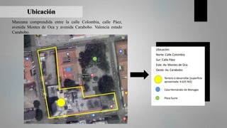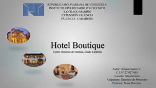 Este documento propone el desarrollo de un hotel boutique en el centro histórico de Valencia, Venezuela. La ubicación propuesta es una manzana entre varias calles y avenidas importantes. El hotel aprovecharía la ubicación céntrica y el flujo de turistas para generar ingresos constantes. Además, se conectaría con un icono histórico local. Sin embargo, existen algunas debilidades como la falta de garantía de financiamiento y amenazas como la inestabilidad económica del país. El proyecto busca promover
