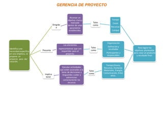 La gerencia de proyecto identifica necesidades específicas en una empresa y propone soluciones mediante proyectos que buscan alcanzar objetivos dentro de un marco de tiempo, costo y recursos establecidos. La oficina de gestión de proyectos (PMO) coordina estos proyectos, enfatizando en la planificación, priorización y centralización de riesgos y recursos. El ciclo de vida de un proyecto se organiza en fases, definiendo claramente los trabajos y responsabilidades a cumplir para garantizar el éxito del proyecto.