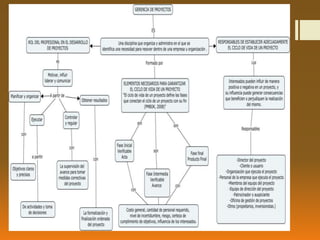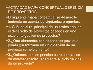El documento presenta un mapa conceptual sobre la gerencia de proyectos de tecnología educativa en campus virtuales. El mapa conceptual busca responder tres preguntas clave: 1) Cuál es el rol principal de un profesional en el desarrollo de proyectos basados en una excelente gestión de proyectos, 2) Qué elementos son necesarios para garantizar un ciclo de vida completo de un proyecto, y 3) Quiénes son los principales responsables de establecer adecuadamente el ciclo de vida de un proyecto. El documento concluye resalt