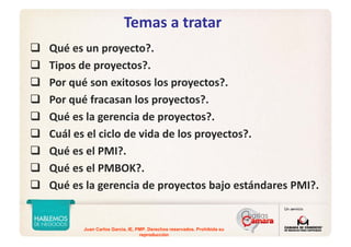 Este documento discute la gerencia de proyectos y por qué los proyectos tienen éxito o fracasan. Explica que la mala estimación de tiempos y costos durante la planificación es el factor más común que contribuye al fracaso de los proyectos. También señala que la aplicación de metodologías establecidas de gerencia de proyectos conduce a mejores resultados en alcance, calidad y beneficios, aunque no necesariamente en el cumplimiento de presupuestos y cronogramas. Finalmente, concluye que los proyect