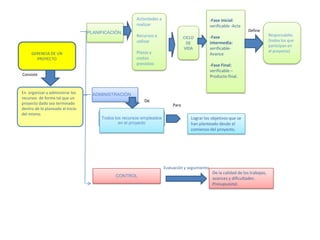 La gerencia de proyectos consiste en organizar y administrar los recursos para asegurar que un proyecto se complete según lo planeado, incluyendo las fases de planificación, ejecución con verificación de avances, y fase final para entregar el producto terminado, controlando costos, plazos, calidad y responsables durante todo el ciclo de vida del proyecto.