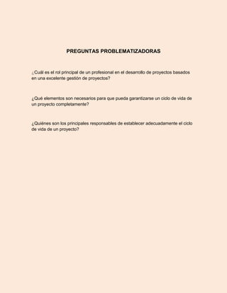 El documento habla sobre la gerencia de proyectos y el ciclo de vida de un proyecto. Explica que el rol principal de un profesional en el desarrollo de proyectos es realizar tareas de planificación, organización, selección de personal, ejecución y control. Señala que los elementos necesarios para garantizar el ciclo de vida de un proyecto son fases inicial, intermedia y final con entregables en cada etapa. Además, los principales responsables de establecer adecuadamente el ciclo de vida son los gerentes de proyect