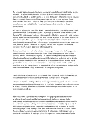El documento describe un modelo de gerencia inteligente para escuelas primarias que promueva la innovación educativa. El modelo busca transformar la gestión escolar mediante cinco fases que incluyen el diagnóstico de prácticas actuales, la descripción de programas innovadores y la implementación de un nuevo modelo gerencial basado en las habilidades y potencialidades humanas para impulsar experiencias innovadoras en los planes educativos.