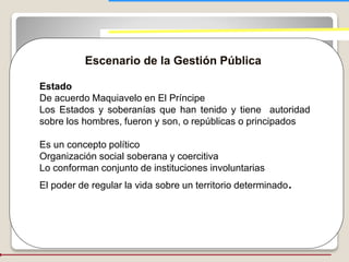 Este documento trata sobre la gerencia pública. Explica que la administración pública conecta directamente a los ciudadanos con el poder político para satisfacer los intereses públicos. La gerencia pública involucra prácticas especializadas para ejecutar funciones como la planeación, programación y evaluación de los recursos del estado de manera eficiente y vinculada a los objetivos del estado. Finalmente, identifica algunos obstáculos de la gerencia pública como un exceso de reglamentos, falta de continuidad en planes y una función pública inadecuada.