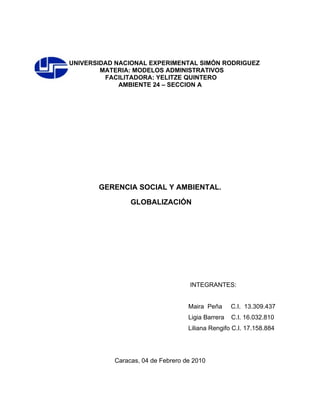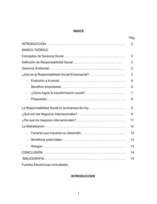 Este documento presenta información sobre gerencia social y ambiental, responsabilidad social empresarial y globalización. Define conceptos como gerencia social, responsabilidad social y gerencia ambiental. Explica la evolución de la responsabilidad social empresarial y cómo lograr una transformación social. También describe los negocios internacionales, la globalización y sus factores, beneficios y riesgos. El documento concluye enfatizando la importancia de que las empresas asuman voluntariamente su responsabilidad social.