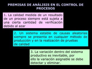 1. El documento habla sobre el control de procesos, el cual consiste en medir resultados y verificarlos con respecto a las especificaciones. Esto puede hacerse midiendo todos los resultados o sólo muestras tomadas frecuentemente.