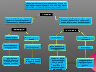 Este documento compara y contrasta la gerencia pública y privada. La gerencia pública se ocupa de realizar la voluntad del Estado de manera sin fines de lucro, generando empleos y servicios sociales. La gerencia privada coordina los recursos de una empresa con el fin de obtener ganancias para sus inversionistas. Ambos tipos de gerencia enfrentan desafíos en Venezuela como la inestabilidad laboral y falta de capacitación, pero la gerencia pública tiene un gran poder económico al establecer alianzas entre sectores.