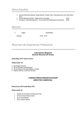 Gerardo Rafael Balseca Coloma es un experimentado ejecutivo de ventas farmacéuticas con más de 25 años de experiencia en el sector. Actualmente se desempeña como Gerente Nacional de Ventas en Laboratorios Biogenet, donde es responsable del presupuesto general, canales de distribución, equipos de ventas y visitas médicas. Anteriormente ocupó cargos directivos en otras empresas farmacéuticas del Ecuador y Perú. Balseca Coloma posee una sólida formación académica y capacitación continua en negocios.