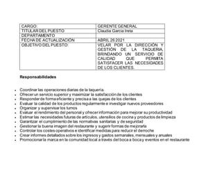 Este documento describe el puesto de Gerente General de una taquería. Las responsabilidades principales incluyen coordinar las operaciones diarias, maximizar la satisfacción de los clientes, evaluar la calidad de los productos, organizar los turnos del personal, controlar los costos y crear informes financieros. El 40% del tiempo se dedica a planificar, organizar y controlar la operatividad del restaurante. El salario promedio de un Gerente de Restaurante es de $92,877 dólares al año.