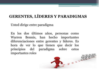 Este documento discute las diferencias entre gerentes y líderes. Los gerentes administran dentro de un paradigma existente, mientras que los líderes dirigen entre paradigmas e impulsan el cambio. Los líderes son innovadores, tienen una visión de largo plazo y desafían el statu quo. Para conducir cambios paradigmáticos se necesitan líderes, no solo gerentes.