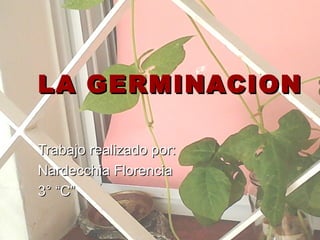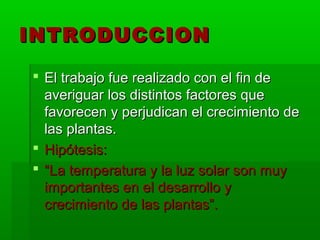 Este documento resume un experimento sobre los factores que afectan la germinación de las plantas. Se colocaron semillas de porotos en tres germinadores con diferentes condiciones: uno expuesto a la luz solar y temperatura ambiente, otro en la oscuridad, y otro en la heladera. El germinador expuesto a la luz y temperatura ambiente mostró un crecimiento saludable de las plantas, mientras que los otros germinadores mostraron poco o ningún crecimiento, lo que confirma la hipótesis de que la luz y la temperatura son importantes