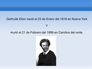 Gertrude Elion nació en 1918 en Nueva York y murió en 1999 en Carolina del Norte. Fue una bioquímica y farmacóloga estadounidense que se licenció en el Hunter College en 1937 y la Universidad de Nueva York en 1941. En 1988 recibió el Premio Nobel de Fisiología y Medicina por el descubrimiento de importantes sustancias bioquímicas.