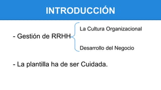 El documento habla sobre la gestión de recursos humanos en pequeñas empresas. Explica que la plantilla es fundamental para el éxito de la empresa y puede afectar positiva o negativamente a la imagen y crecimiento de la organización. También describe las políticas y objetivos clave de la gestión de recursos humanos así como la importancia de la cultura organizacional.