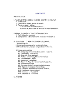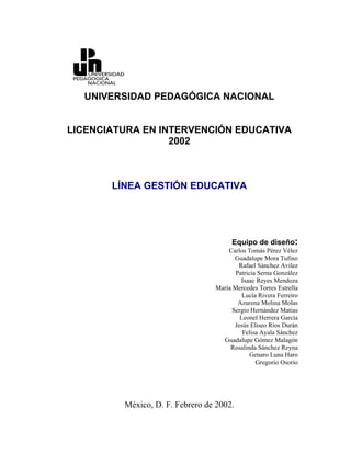 Este documento presenta la propuesta curricular de la Línea Específica de Gestión Educativa de la Licenciatura en Intervención Educativa de la Universidad Pedagógica Nacional. En menos de 3 oraciones: