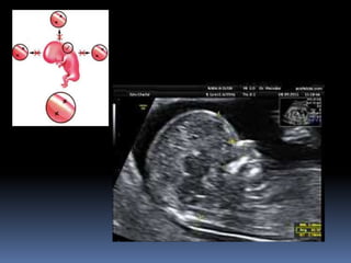 Este documento resume diferentes tipos de hemorragias y gestaciones anormales, incluyendo hemorragia con y sin gestación intrauterina, fracaso de la gestación, hemorragia peri gestacional, gestación anembrionada, mola, ectopía, gestación heterotópica, retención de productos de concepción, y anomalías del saco vitelino y del cordón umbilical. Proporciona detalles sobre las características ecográficas de cada condición para ayudar en el diagnóstico.