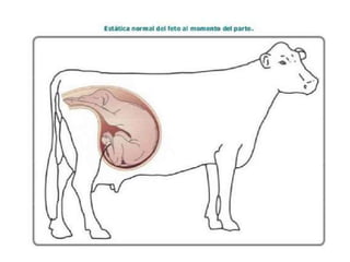 El documento describe las etapas del parto en vacas, incluyendo la fase de preparación, la expulsión del producto y la expulsión de la placenta. Explica los mecanismos hormonales y fisiológicos que desencadenan el parto, como la caída de progesterona y el aumento de estrógenos y cortisol. También cubre signos de parto inminente y posiciones fetales durante el proceso.