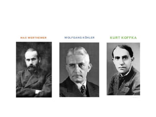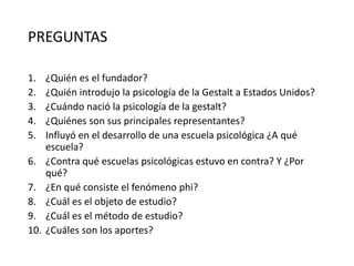 La psicología de la Gestalt surgió en Alemania a principios del siglo XX y se centra en el estudio de la percepción y procesos mentales como totalidades organizadas y significativas, en contraposición a estudiarlos como suma de elementos aislados. Sus principales representantes fueron Max Wertheimer, Wolfgang Köhler y Kurt Koffka.
