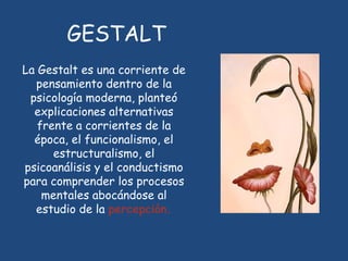 La Gestalt es una corriente psicológica que estudia la percepción. Propone que la mente organiza los elementos sensoriales de acuerdo a ciertas leyes como la figura-fondo, la buena forma y la semejanza. Estas leyes generales incluyen principios como la proximidad, continuidad y simetría. La Gestalt ha tenido aplicaciones en el campo educativo, donde destaca el pensamiento productivo, y en las artes visuales como el cubismo.