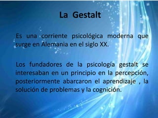 La psicología Gestalt, surgida en Alemania en el siglo XX, se centra en la percepción y cómo organizamos la información en unidades completas y estructuradas, teniendo un impacto en áreas como el aprendizaje y la cognición. Se basa en principios como la ley de pregnancia y la ley del cierre, los cuales indican que el cerebro prefiere formas simples y completas al interpretar el entorno. Además, su aplicación se extiende al arte y la educación, promoviendo el pensamiento productivo y el análisis experimental de la realidad.