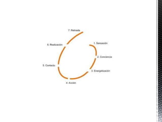 La terapia Gestalt, desarrollada por Fritz Perls y Lore Posner en la década de 1950, se basa en una perspectiva holística que considera al ser humano como un todo. Se centra en el aquí y ahora, ayudando al paciente a asumir la responsabilidad personal a través del darse cuenta de la experiencia corporal, emocional y mental. Las técnicas de Gestalt incluyen métodos supresivos para dejar de lado comportamientos limitantes, expresivos para exteriorizar emociones reprimidas y integrativas para incorporar las partes alien
