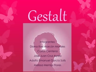 Este documento describe la escuela psicológica de la Gestalt. Surge en Alemania en 1910 y se centra en cómo percibimos el mundo y nos comportamos. Sus fundadores incluyen a Max Wertheimer, Kurt Koffka y Wolfgang Köhler. Proponen leyes como la figura-fondo, la buena forma y la proximidad. La terapia Gestalt, desarrollada por Fritz Perls, busca que los pacientes se integren a sí mismos mediante la conciencia del momento presente.