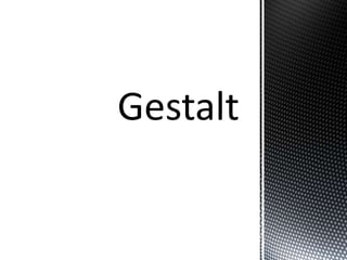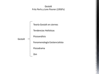 La terapia Gestalt se centra en el aquí y ahora y fue desarrollada por Fritz Perls y Lore Posner en la década de 1950. Se basa en teorías holísticas y fenomenológicas que ven al ser humano como un todo, no como partes separadas. El enfoque de Gestalt es ayudar al cliente a lograr la autorrealización mediante el autoconocimiento, la satisfacción y el autoapoyo en el presente. Utiliza técnicas como la expresión directa y la terminación de frases para que el cliente se conecte con experi
