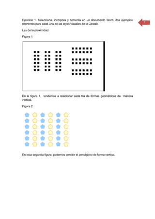 Este documento presenta ejemplos de las leyes visuales de la Gestalt, incluyendo la proximidad, semejanza, cierre, simetría, continuidad y figura-fondo. Para cada ley, se proporcionan dos figuras que ilustran cómo nuestra percepción tiende a agrupar visualmente los elementos de acuerdo con esas leyes. También incluye un enlace a un recurso educativo sobre la percepción visual para estudiantes de primaria.
