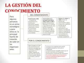 El documento define la gestión del conocimiento como la identificación, optimización y gestión dinámica de los activos intelectuales en forma de conocimiento explícito o tácito poseído por personas o comunidades. También señala que la gestión del conocimiento tiene en el aprendizaje organizacional su principal herramienta y que la gestión por el conocimiento es la gestión de los activos intangibles que generan valor para la organización.