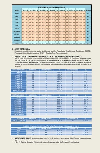 El colegio informó sobre sus resultados en el año 2012, destacando que tuvo una matrícula de 728 estudiantes. El porcentaje de promoción fue de 94.51% y la tasa de repitencia fue de 5.49%. Los resultados SIMCE se informarían una vez publicados por el MINEDUC. El informe proporcionó estadísticas históricas sobre los resultados SIMCE y la situación académica del colegio en los últimos años.