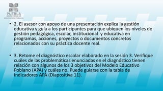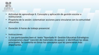 La actividad de aprendizaje se centra en la gestión escolar e institucional, buscando vincular a los participantes con la comunidad educativa a través de un diagnóstico y la elaboración de propuestas de solución. Se requiere la lectura de material sobre gestión educativa, discusión en grupos, y la creación de un documento formal que refleje el trabajo en equipo. Además, se destaca la importancia de los indicadores del modelo educativo poblano en la evaluación de la asistencia, permanencia y aprendizaje de los estudiantes.