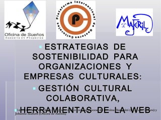 El documento describe estrategias de sostenibilidad para organizaciones culturales, destacando la importancia de la gestión cultural colaborativa y herramientas de la web 2.0. Presenta un análisis del impacto de la inteligencia colectiva y la evolución de la web hacia plataformas más participativas, donde los usuarios son tratados como co-desarrolladores. También se mencionan ejemplos de aplicaciones web avanzadas y la influencia social que han tenido en la distribución de recursos culturales y educativos.