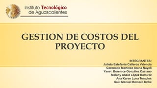 El documento describe los cuatro principales procesos de gestión de costos de proyectos: 1) Planificación de recursos para determinar los recursos necesarios, 2) Estimación de costos para desarrollar una aproximación de los costos, 3) Presupuestación de costos para asignar los costos estimados a actividades individuales, y 4) Control de costos para monitorear cambios en el presupuesto. La gestión de costos del proyecto se enfoca en los costos de recursos para completar las actividades del proyecto y también debe considerar el efecto de