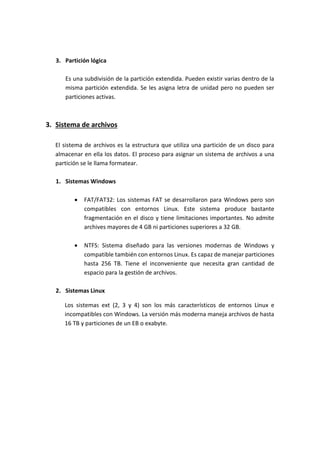 La estructura física de un disco duro incluye discos, caras, cabezas, sectores y pistas. Lógicamente, está compuesto por el sector de arranque maestro, el espacio particionado y no particionado. Un disco duro puede tener particiones primarias, extendidas y lógicas. Los sistemas de archivos como FAT, NTFS, y ext organizan los datos en las particiones. Herramientas como Partition Magic y GParted permiten gestionar particiones, mientras que Easy Recovery recupera archivos eliminados. El form